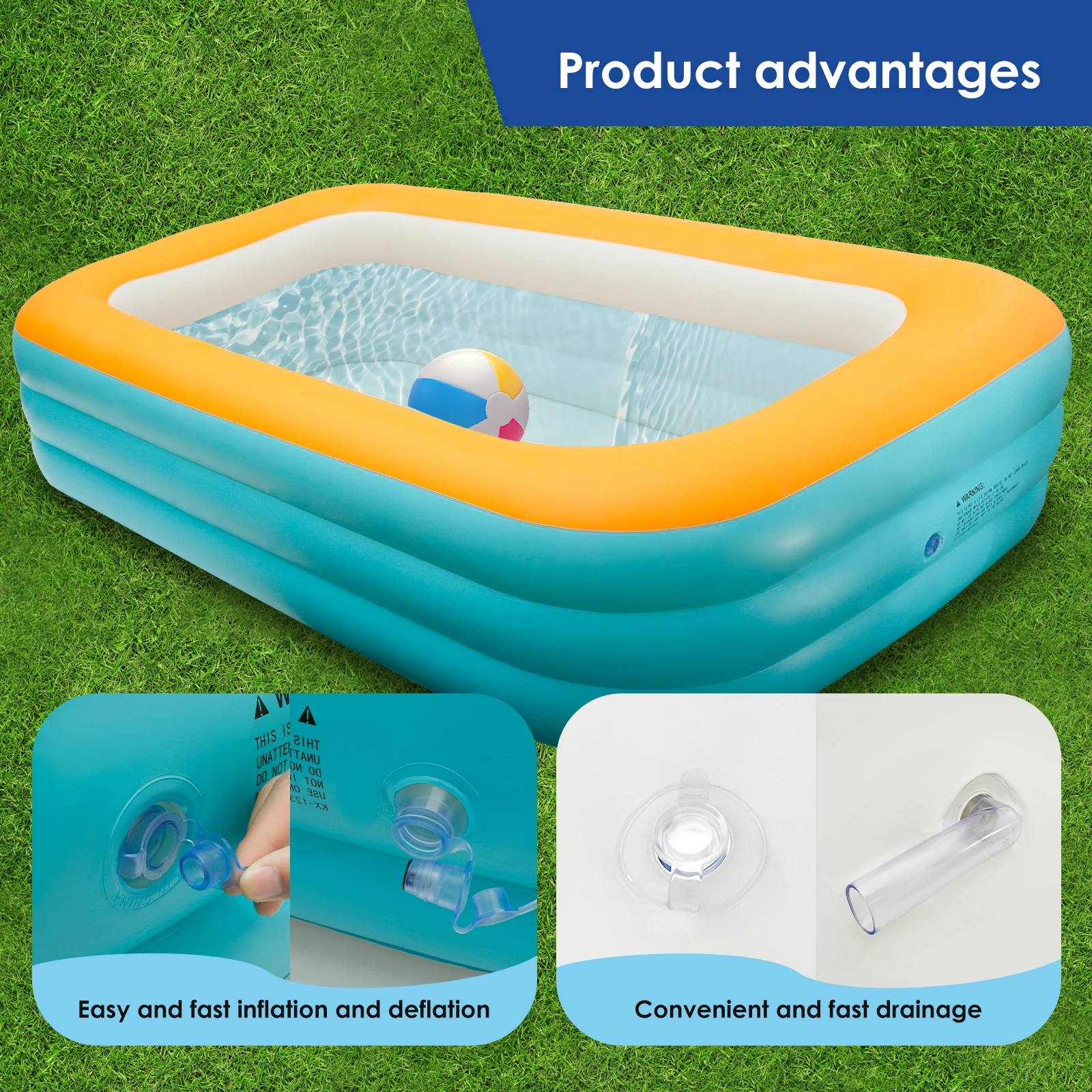 [With Inflatable Soft Floor] This inflatable swimming pool has a soft inflatable floor that can be a cushion between the ground and kids, acting kid protection role. And the inflatable swimming pool is easy to carry and store.