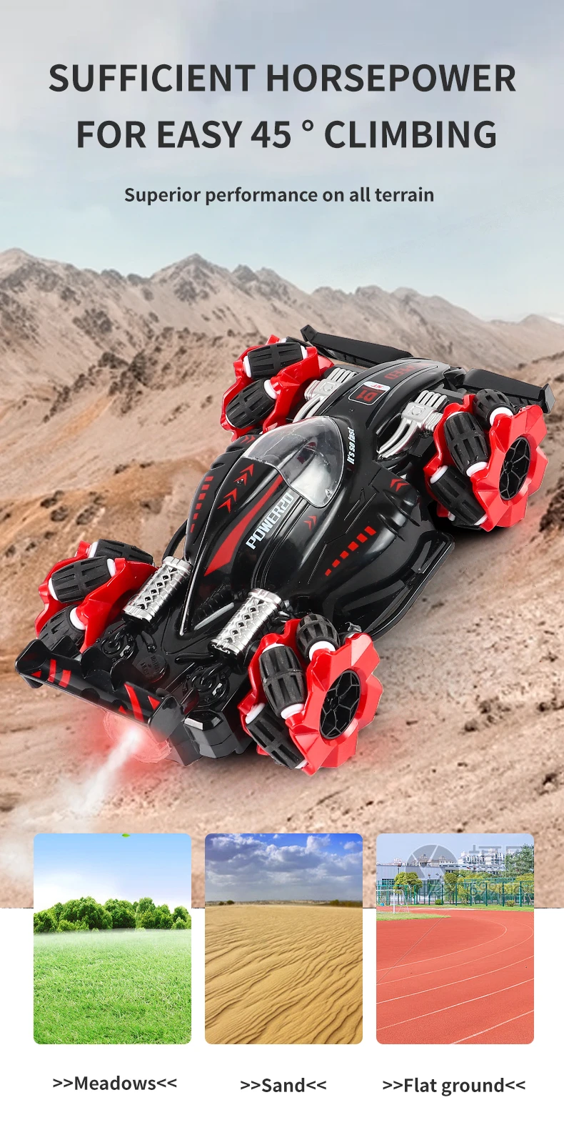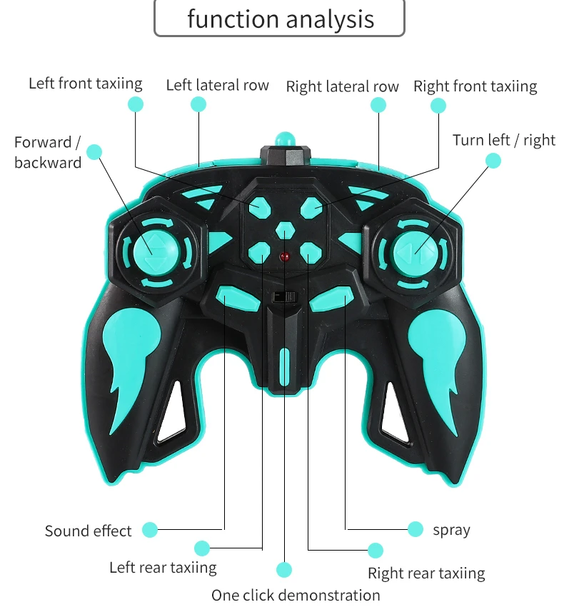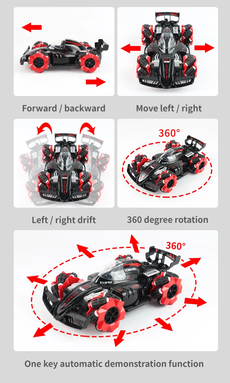 1. Spray Stunt Car: Spray, 360° in situ rotation, 45 ° climbing,music,light,forward,backward, left drift, right drift, lateral drift, stunt rotation, led dazzling light, one button demonstration function;