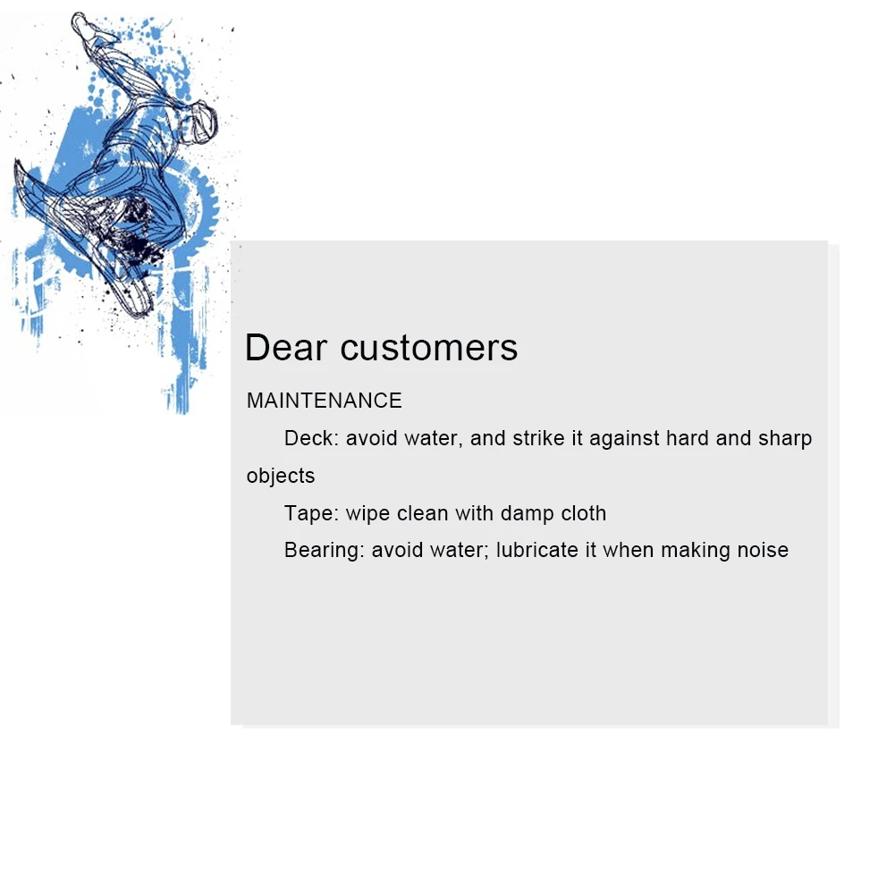*1. wood skateboard, strong and durable to withstand riders up to 50KG, measures at 60x12x13.5cm.