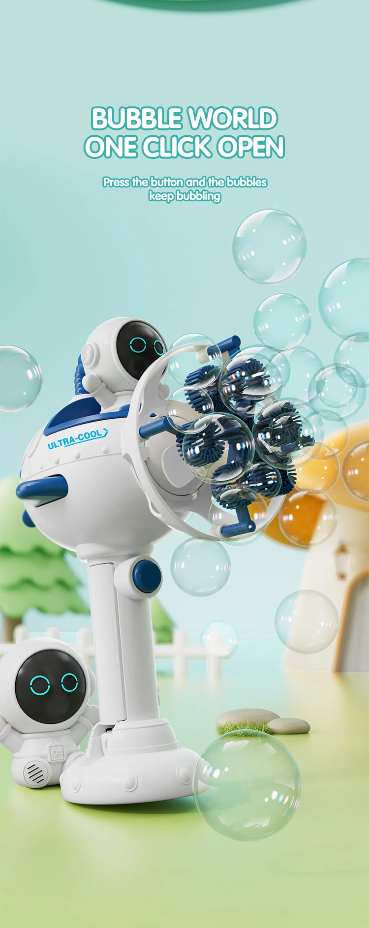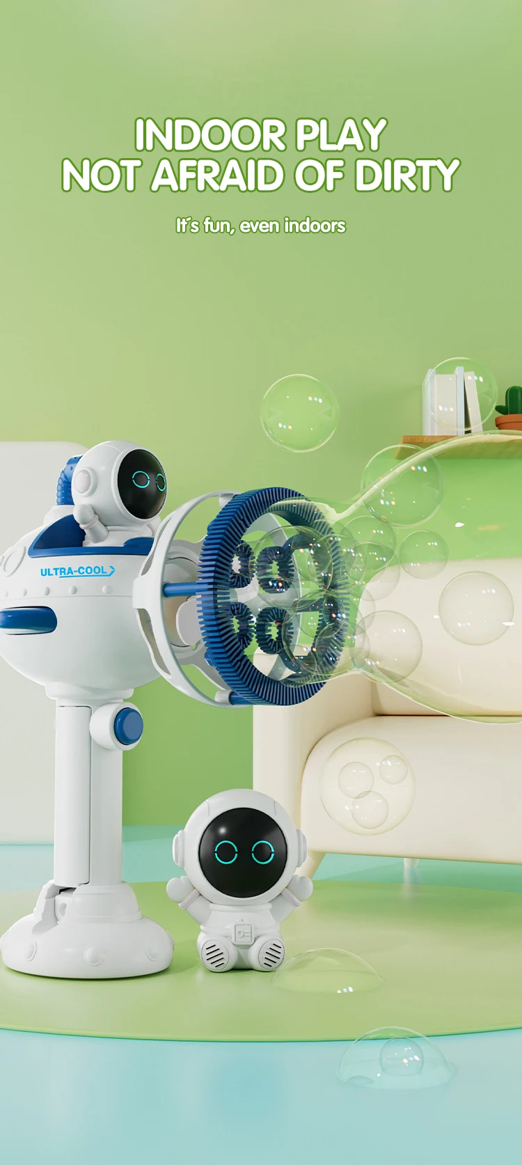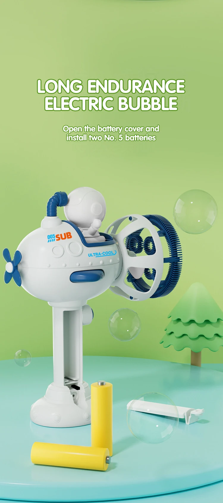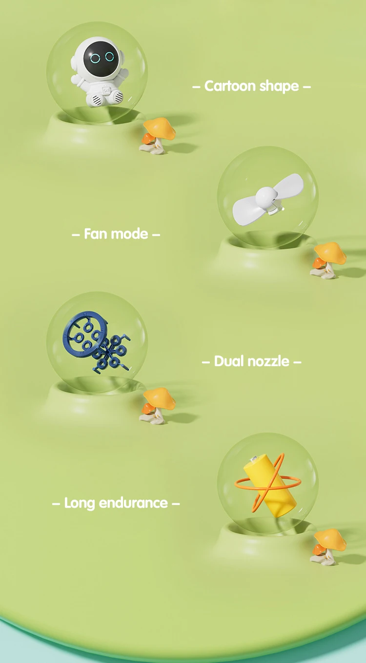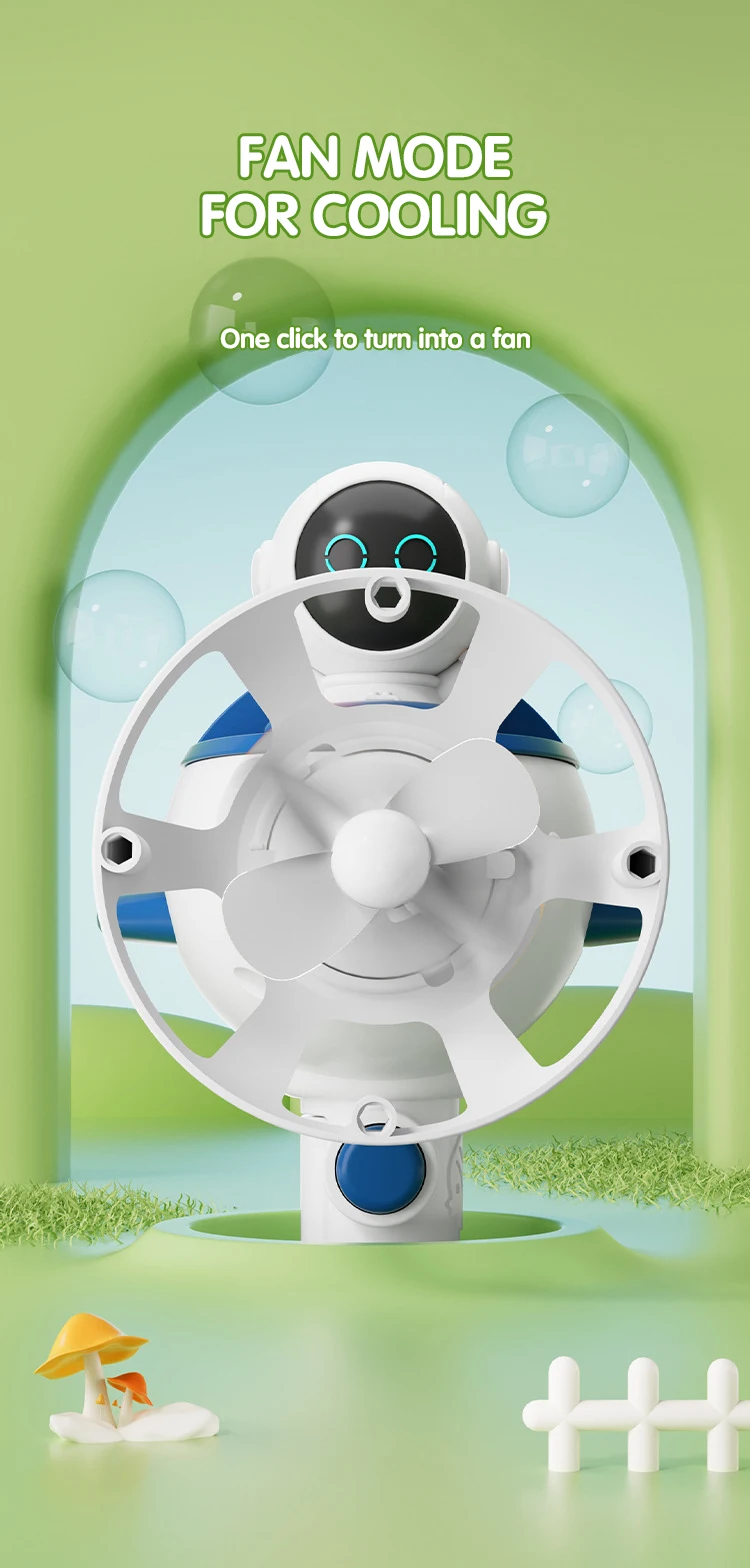 2.Dual-purpose nozzle for blowing bubbles and providing cool air in fan mode.
