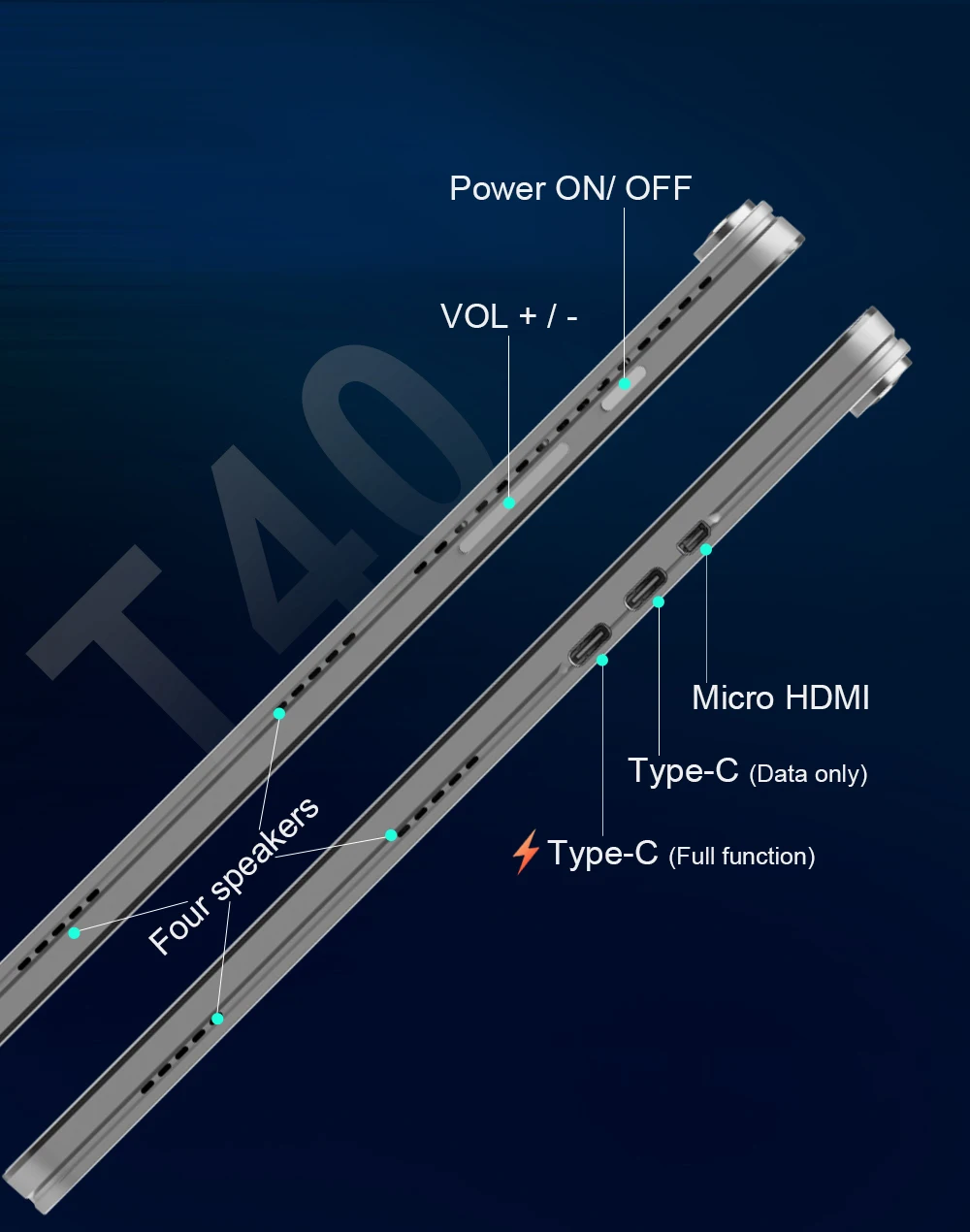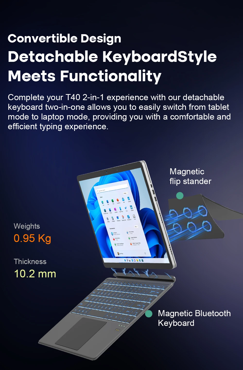 The T40's 2-in-1 design allows it to function as a laptop and easily convert to tablet mode. This flexible use method allows you to find the most suitable operating mode for you in different scenarios to meet your diverse needs.