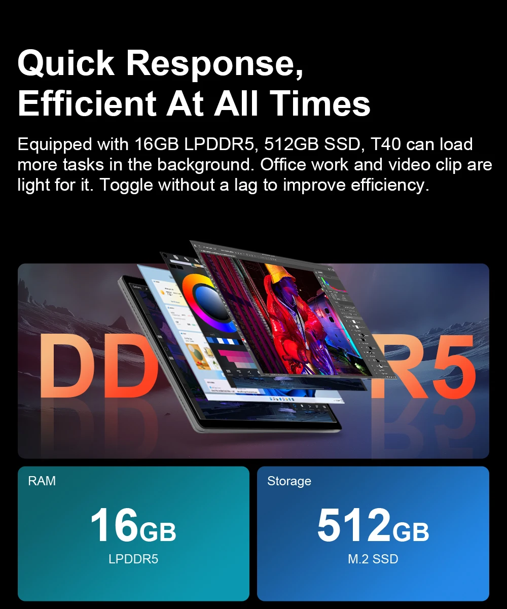 T40 is equipped with up to 16GB of LPDDR5 memory and 512GB of M.2 SSD storage space, so you no longer have to worry about insufficient memory or tight storage space. Whether it's storing large files, downloading high-definition videos, or running professional software, it can handle it with ease, allowing you to enjoy your digital life as you please.